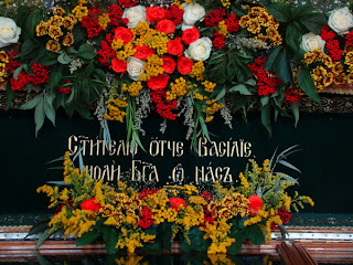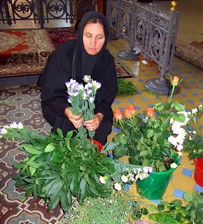 В канун дня памяти свт.Василия Кинешемского сестры украшают раку со святыми мощами Святителя. В этом году в композиции, кроме традиционных цветов – роз и хризантем, использовали полевые растения – золотарник, пижму, ягоды бузины и ветви ивы.