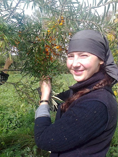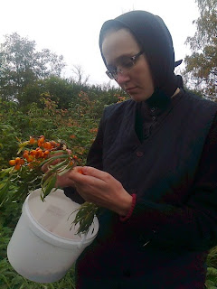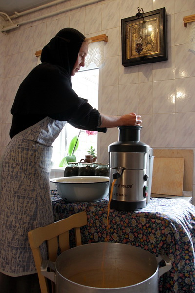 Вчера сестры ездили собирать, сегодня делают сок. Облепиху отжимают, варят 3 минуты, снимают пену, закрывают в стерилизованные банки. Зимой концентрированный сок разведут и в постные и праздничные дни он будет на столах, а больные могут получить его в любое время. Жмых облепихи заморозили – он тоже зимой пойдет в дело, проварят и будут добавлять в морсы. Часть жмыха перемолют, высушат, зальют растительным маслом, настаивают 40 дней в темном месте – получится прекрасное облепиховое масло. Впереди – сбор шиповника и боярышника.