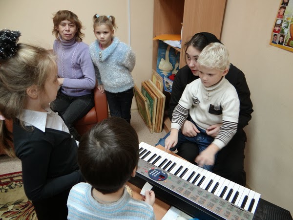 23 октября сестры Введенского женского монастыря посетили Центр подготовки приемных родителей и сопровождения замещающих семей на базе областного государственного образовательного учреждения (ОГОУ) для детей-сирот и детей, оставшихся без попечения родителей «Ивановский детский дом «Ровесник». На занятии по пению малыши продолжили подготовку к Рождественским праздникам: разучивали колядки и другие песни, учились играть на синтезаторе. Даже маленький Саша, который на прошлых занятиях не участвовал в пении, на этот раз присоединился к остальным детишкам и подпевал, сидя у папы на коленях.