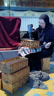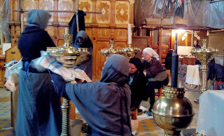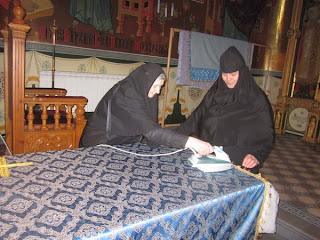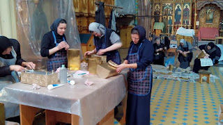Вдохновение и молитва – два необходимых спутника в этом ответственном деле. Для каждой сестры находится работа: одни забираются на высокие лестницы и моют окна, другие оттирают стены, третьи полируют деревянные киоты и раки с мощами.