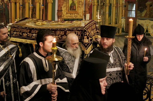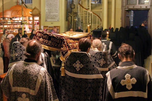 По окончании великого славословия с пением погребального «Святый Боже» Плащаница была вынесена через западные врата Введенского храма и обнесена вокруг него крестным ходом.