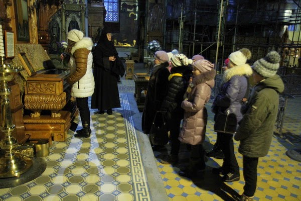 Экскурсия по Введенской обители началась с главной достопримечательности – храма с более чем вековой историей. Экскурсовод монахиня Феофила (Кайдаулова) рассказала гостям о храме, обители — как проходит жизнь в монастыре, какие послушания несут сестры; побеседовала со школьниками на духовные темы.