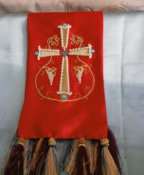 Шьем и вышиваем для алтаря. На фотографиях закладка для напрестольного Евангелия и кайма будущей пелены на престол (еще одна кайма в пяльцах, на днях будет готова)».