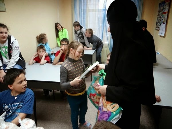 После беседы пришло время подарков: каждому ребенку сестры привезли по монастырскому пасхальному куличу, плитке шоколада и красочной детской книге.