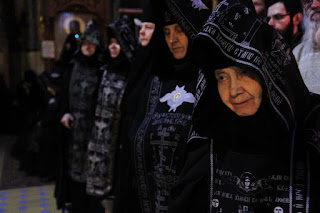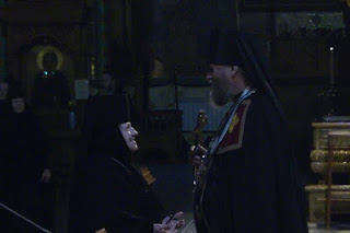 Потом, как обычно, следует Вход и пение “Свете Тихий…” Затем служащий священник идет на “горнее место”, за престолом, и возглашает вечерний Прокимен, который всегда возвещает конец одного и начало другого дня. За этой вечерней “Великий Прокимен” возвещает начало Поста: