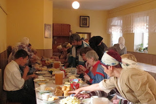 Перед трапезой многие гости зашли в храм помолились, все вместе помолились перед трапезой. Насельницы обители рассказали о посещении Афона Святейшим Патриархом, предложили малоимущим духовную литературу, иконки, которые наши гости всегда с удовольствием разбирают.