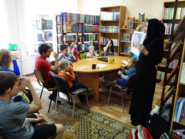 Воспитанники узнали, сколько всего было Вселенских соборов и какие основные вопросы рассматривались на каждом из них. Более подробно ин. Фотиния остановилась на первых двух соборах. После просмотра короткометражных фильмов из цикла «Закон Божий» о Никейском и Константинопольском соборах инокиня рассказала и о святых отцах, присутствовавших на них. Святителя Николая сразу узнали все дети, а вот про святителя Спиридона Тримифунтского большинство детей услышали впервые. Инокиня рассказала воспитанникам о чуде, сотворенном святителем, как на Соборе в Никее святитель Спиридон так объяснил арианам исповедуемое православными единство трех Божественных Ипостасей Святой Троицы. Святой взял в руки кирпич и сжал его. Вверх мгновенно метнулся огонь, вода потекла вниз, а глина осталась в руках чудотворца.