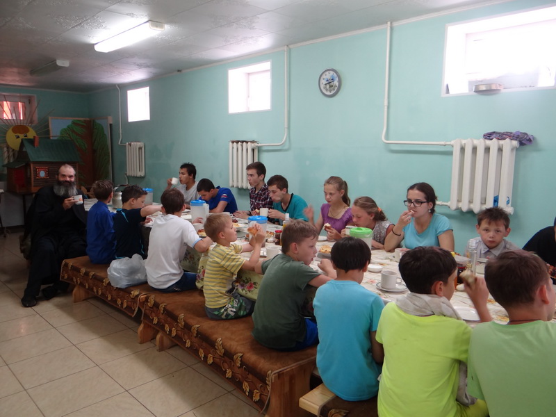 После богослужения юных гостей ожидала праздничная трапеза. Дети отведали рыбный суп, плов, овощи, какао из свежего подворского молока, сметану, сыр, яйца и сладкий десерт. После обеда ребята помогли братии убрать со стола и помыть посуду, чему монахи были приятно удивлены.