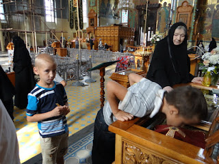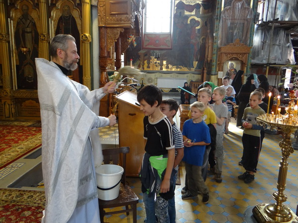 В конце Богослужения юные гости приложились к иконе Преображения Господня и к святым мощам. Приложившись ко кресту, дети испросили благословения, а протоиерей Михаил окропил каждого святой водой.