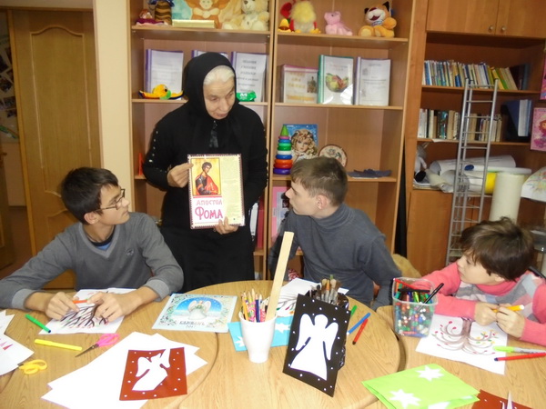 19 октября Православная Церковь чтит память святого апостола Фомы. Накануне праздника трудница Введенского монастыря Ирина встретилась с семьями Центра подготовки приемных родителей и сопровождающих семей. На занятии Ирина рассказала детям и их родителям о святом апостоле. Ирина объяснила, откуда в народе появилось выражение «Фома неверующий». По свидетельству Священного Писания, святой апостол не поверил рассказам других учеников о Воскресении Иисуса Христа: «Аще не вижу на руку Его язвы гвоздинныя, и вложу перста моего в язвы гвоздинныя, и вложу руку мою в ребра Его, не иму веры» (Ин.20:25). На восьмой день после Воскресения Господь явился апостолу Фоме и показал Свои раны. «Господь мой и Бог мой!» – воскликнул святой апостол (Ин.20:28).