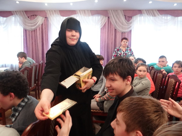 На этой неделе день за днем следуют сразу три больших праздника: Благовещение Пресвятой Богородицы, Лазарева Суббота и Вход Господень в Иерусалим. Послушница Елисавета рассказала детям об этих важных Евангельских событиях. Несмотря на ограниченные возможности юных слушателей, они с интересом слушали рассказ и задавали вопросы. Посл. Елисавета исполнила духовные канты, ин. Фотиния помазала всех святым маслом и вручила подарки: иконы, шоколад, а педагогам и руководству – духовную литературу — книги «Яко с нами Бог» и «Монастырь». Сестры привезли на встречу святыню – воду из г. Назарета от источника Благовещения. Все дети и руководство с молитвой попили этой святой воды.