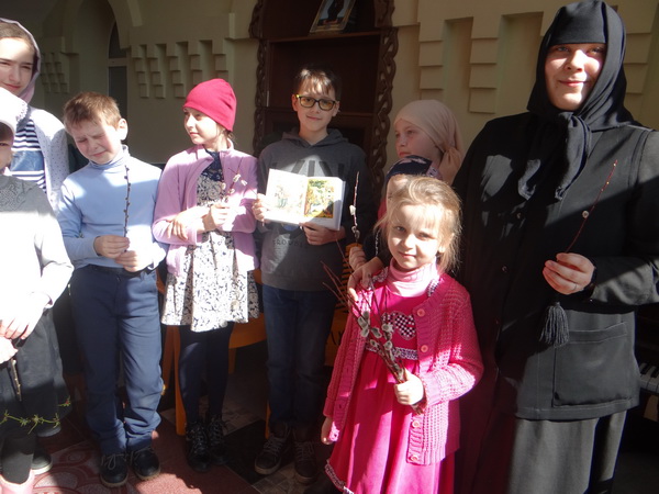 В этот воскресный день беседу с прихожанами и гостями обители, воспитанниками детского дома «Ровесник», провели монахиня Ювеналия (Морозова) и послушница Елисавета. Мон.Ювеналия рассказала о духовном смысле праздников: Благовещения Пресвятой Богородицы, Воскрешении Лазаря и Входе Господнем во Иерусалим.