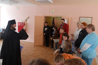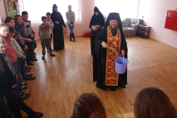 Иеромонах Даниил рассказал детям о Евангельских событиях Воскресения Спасителя, а также о современных спорах и доказательствах их истины. О. Даниил совершил молебен по пасхальному чину, а затем, пока инокиня Василисса и послушница Елисавета пели пасхальные песни, окропил святой водой все помещения Центра. На удивление всех, сразу после совершения молебна за окнами развеялись тучи и выглянуло солнце.