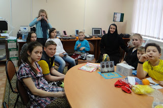 Дети посмотрели видеозапись, как сестры готовились к празднику Пасхи: пекли и украшали куличи, красили луковой шелухой яйца; как затем священники в храме их освящали. Ин.Фотиния показала видео праздничного Пасхального Богослужения, объясняя ход службы.