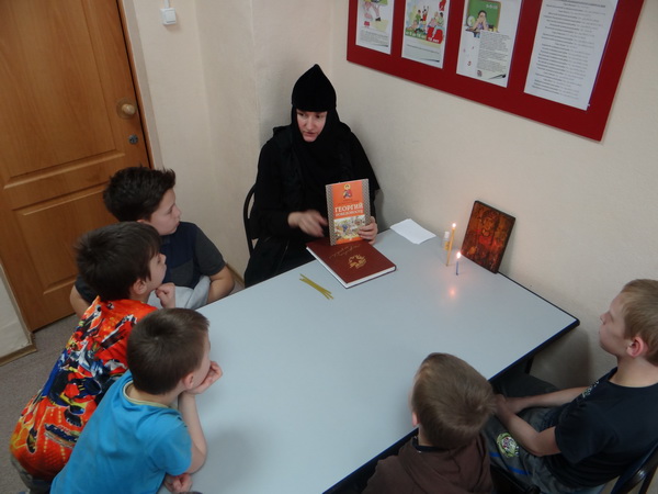 В день памяти святого Георгия Победоносца насельница Введенского женского монастыря инокиня Фотиния встретилась с воспитанниками детского дома «Ровесник», чтобы побеседовать с детьми о наступающем празднике – Дне Победы.