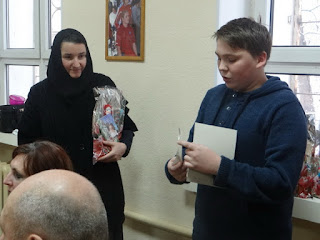Особенно радостно было инвалидам получить подарки от детей. Воспитанники заранее смастерили открытки с пожеланиями и кукол из текстиля, а сестры добавили к этим поделкам подарки от социального отдела: духовную литературу, монастырский мед, кружки и чай.