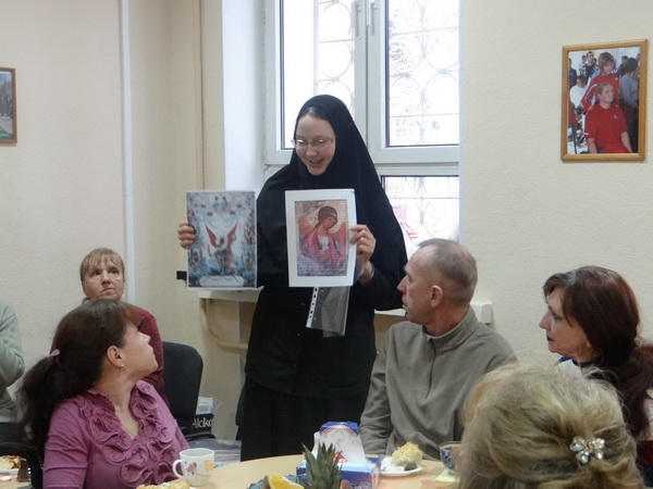 Инокиня Екатерина рассказала об иерархии Небесного ангельского воинства, о том, как разные чины изображаются на иконах, привела примеры помощи святых ангелов людям. Постепенно рассказ перешел в оживленную беседу, в которой почти каждый привел свои воспоминания чудесной помощи. Кто-то чудом избежал аварии на дороге, кто-то получил помощь при сложной операции, кто-то избежал ранения на фронте.