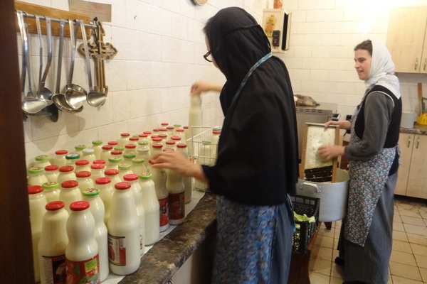 На этот раз обед в себя включал: борщ, макароны с яйцом, салат из свежих овощей, сельдь, сыр, яйцо, свежее молоко, творог, сметану, чай, сладости и монастырскую выпечку. Все собравшиеся пообедали и взяли порции своим родным и близким. Дети получили сладкие подарки.