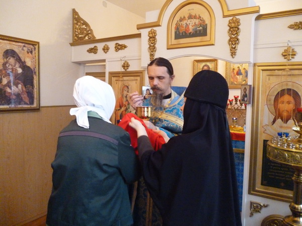 Несколько раз в месяц в женскую колонию № 7 приезжают клирики и сестры Введенской обители, чтобы совершить Божественную литургию в домовом храме в честь иконы Божией Матери «Скоропослушница». На этой неделе Богослужение совершил иеромонах Тихон (Просыпкин), а в завершении Литургии с верующими женщинами побеседовал иеромонах Василиск (Кишеня).