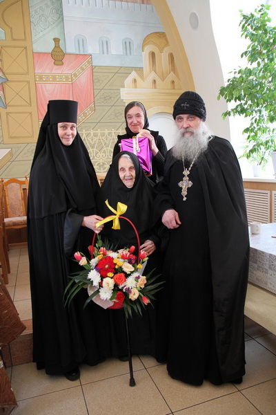 За Божественной литургией преждеосвященных Даров тепло поздравил матушку с днем рождения митрополит Иваново-Вознесенский и Вичугский Иосиф, благословил матушку и наградил архиерейской грамотой по случаю 100-летнего юбилея. За трапезой игумения, клирики, сестры вспомнили яркие события, связанные с матушкой. Сама схим.Евдокия пожелала сестрам чаще молиться Богу и Божией Матери: «Божия Матерь нас охраняет и помогает».