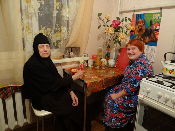 Нина Васильевна ждала гостей со своей подругой Клавдией, которую сестры тоже знают уже давно. Сестры рассказали о почитаемом образе Божией Матери «Иверская», историю появления этого образа во святой обители на Афоне. За чашкой чая поговорили о житейских проблемах, о предстоящих совместных встречах. У Нины Васильевны недавно был день рождения, ей исполнилось 83 года. Сестры поздравили ее и вручили подарки — монастырские хлеб и выпечку.