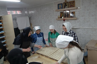 Вместе с сестрами воспитанницы научились раскатывать тесто, вырезать заготовки для просфор, наносить печати на верхние части. Пока просфоры находились в печи, девочки побеседовали с просфорницами и узнали много интересного о просфорах, их приготовлении и хранении.