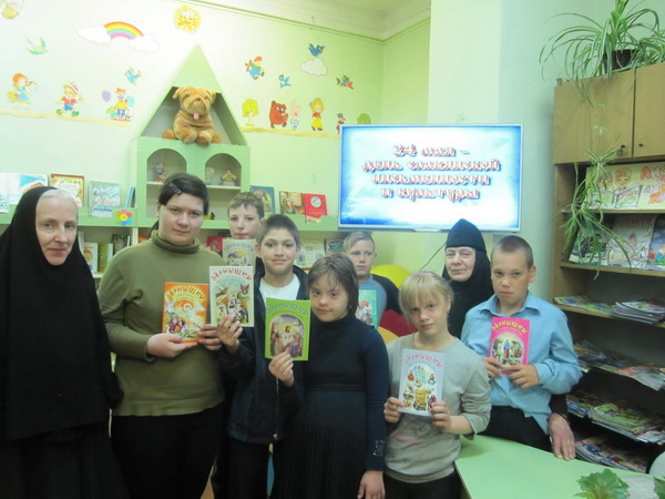 24 мая мы отмечаем память святых братьев-монахов Кирилла и Мефодия, создателей и распространителей славянской письменности. 17 мая сотрудники комиссии по канонизации святых Иваново-Вознесенской епархии монахини Ювеналия (Морозова) и Афанасия (Васильева) посетили Детскую библиотеку в г. Пучеже по приглашению ее заведующей Галины Сергеевны Кирсановой. На встрече присутствовали ученики 10 класса Пучежского лицея и дети из клуба «Неугомон», обучающиеся в 4 и 5 классах Специальной Коррекционной школы-интерната города Пучежа.