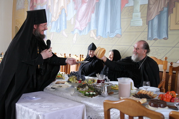 Украсили этот праздничный обед своим пением сестры монастыря, которые исполнили духовные канты. Поздравила батюшку с днем рождения и монахиня Ксения, которая несла послушание келейницы покойного архиепископа Амвросия (Щурова). Матушка Ксения исполнила несколько произведений на скрипке, одно из который она посвятила покойной насельнице Введенского монастыря монахине Мариамне, почившей 6 лет назад в этот день.